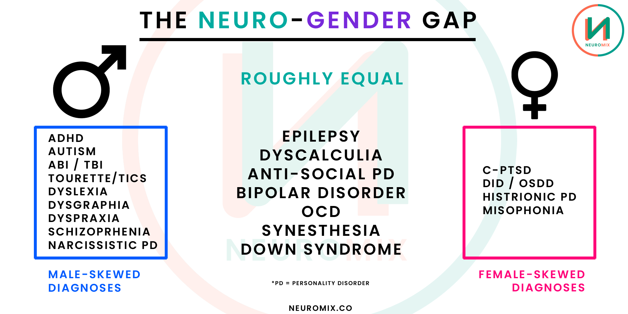 Male Skewed Diagnoses include: ADHD, Autism, Traumatic Brain Injury / Acquired Brain Injury, Tourettes & TIC Disoders, Dyslexia, Dysgraphia, Dyspraxia, Schizophrenia, and Narcissistic Personality Disoder