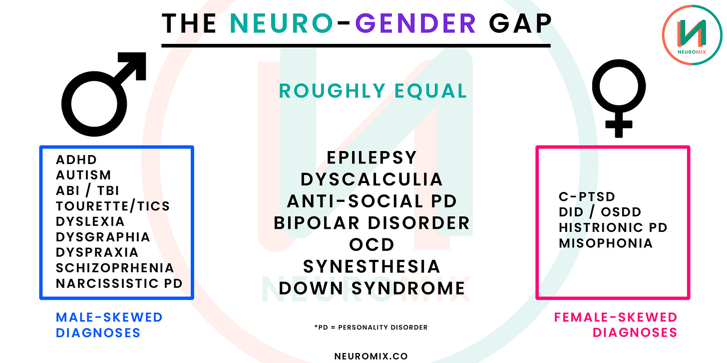 I did some digging and found that there are NINE forms of neurodiversity that men are diagnosed with disproportionately to women, and only four conditions that women are diagnosed with disproportionally to men.