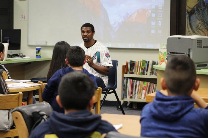 Photo is of a classroom with several students sitting and facing toward the front of the room, where a Black man is guest speaking to them.